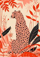 Zalmkleurige luipaard tekening, in de stijl van minimalistische achtergronden, kleurrijke animatiestijl, bloem- en natuurmotieven, lichtrood en lichtoranje.