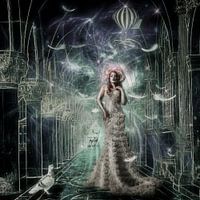 Fotocomposiet: een elegant geklede jongedame in de portiek van een kasteel, omringd door veren en bewonderd door een wit hert en een duif