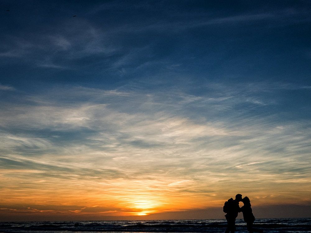 Twee mensen kussen elkaar terwijl ze genieten van de zonsondergang op het strand van noord Denemarken. De zonsondergang wordt weerspiegeld op het natte strand zand. De twee geliefden steken als silhouet af tegen de mooie kleuren in de lucht.