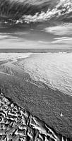 Afgaand tij op het Nolle strand in Vlissingen aan de Westerschelde, beekjes stromend water terug naar zee. Foto in zwart-wit en grijs tinten.