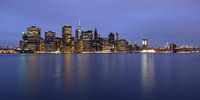 Lower Manhattan Skyline in New York in de avond. Het hoogste gebouw is One World Trade Center. Rechts zie je de Brooklyn Bridge liggen.