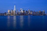 Lower Manhattan Skyline in New York in de avond. Op de voorgrond de Hudson River. Het hoogste gebouw is One World Trade Center. De foto is genomen vanaf New Jersey.