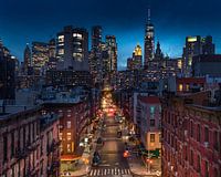 De straten van New York gloeien in de avond en nacht van de verschillende kleuren verlichting. Op de achtergrond de bekende wolkenkrabbers van lower Manhattan maken het sfeer plaatje helemaal af.
