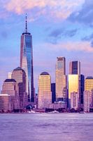 Spectaculair uitzicht op de betoverende skyline van Lower Manhattan in het warme licht van de zonsondergang, gezien vanaf de idyllische Waterfront Walkway in New Jersey. De ondergaande zon baadt de beroemde wolkenkrabbers in gouden en roze tinten terwijl de fonkelende stadslichtjes langzaam aangaan. Deze harmonieuze combinatie van dag en nacht geeft het tafereel een magische en rustgevende sfeer. In het midden van de skyline rijst het imposante One World Trade Center de lucht in, majestueus omlijst door de glazen gevels van de omringende gebouwen, die oplichten in het zachte licht van de zonsondergang.