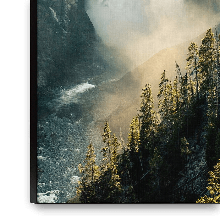 Duotone weergave van blauw en geel van de waterval in Yellowstone. De toppen van de bomen worden nog mooi opgelicht door de zonnestralen.