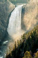 Duotone weergave van blauw en geel van de waterval in Yellowstone. De toppen van de bomen worden nog mooi opgelicht door de zonnestralen.