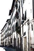 Voor de deur een gracht met snel lopend water. Lucca, Italiaanse stad met vele gezichten. Het is middag en de zon staat hoog aan de lucht.