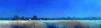 Wat je precies ziet: het bovenste driekwart van het doek wordt gedomineerd door een gradatie van blauwtinten, van helder kobaltblauw naar zachter azuur aan de horizon — een echte lucht schilderij en een schilderij lucht in één. Het veld onderaan is opgebouwd uit korte, ritmische penseelstreken en puntige vlekken die graan en riet suggereren; warme goudbruine en beige toetsen mengen zich met koele blue-gewassen schaduwen. Aan de horizon verschijnen silhouetten van bomen en een paar huizen met terracotta daken — klein, bijna geheimzinnig, waardoor de ruimte nog groter lijkt. Dit is een veld schilderij waarin detail en afstand samen spelen.