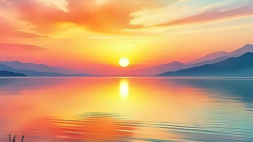 Het licht van de ondergaande zon wordt zachtjes weerkaatst op het oppervlak van een kalm meer, dat werkt als een spiegel en de schoonheid van de lucht weerspiegelt. Kleine golven kabbelen zachtjes tegen de oever terwijl de natuur in een vredige stilte verzinkt. Vogels vliegen in de verte, hun silhouetten zichtbaar tegen de heldere hemel, alsof ze het einde van de dag vieren.