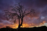 Een dode boom staat gesilhouetteerd tegen een brandende zonsondergang in Australië...