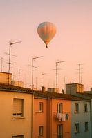 Dit sfeervolle beeld toont een luchtballon die rustig zweeft boven een rij pastelgekleurde woningen. De lucht is zachtroze en warm, alsof de avondzon de wereld nog één keer goud verft. De hoge antennes op de daken vormen een speels ritme dat het oog naar boven leidt, precies naar de ballon. De kleuren van de gevels, variërend van geel…