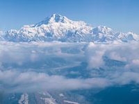 Luchtfoto Denali in Alaska. Vanuit een vliegtuig zicht op de berg die vroeger Mount McKinley werd genoemd. Het is de hoogste berg van Noord Amerika. Op de voorgrond een lange tong van ijs: een gletsjer.
