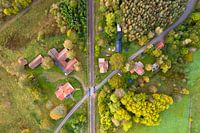 Lijnen doorkruisen een landschap in herfstkleuren, waartussen huizen staan verscholen. Het herfstseizoen is één van de mooiste jaargetijden in Zweden. De loofbomen kleuren geel, oranje en rood.
