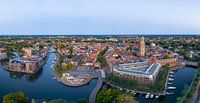 Luchtfoto van de binnenstad van Zwolle tijdens een zomerse zonsondergang. Van bovenaf gezien zien we verschillende historische gebouwen.