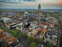 Zwolse binnenstad met de Melkmarkt vanuit de lucht gezien tijdens een voorjaarszonsondergang. Van bovenaf gezien zien we verschillende historische gebouwen, zoals de Peperbus kerktoren.