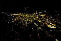 Luchtfoto van Brussel in de nacht vanaf 11 kilometer hoogte gezien.