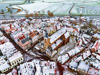 Luchtfoto van Hattem tijdens een koude winterochtend met sneeuw op de daken van bovenaf gezien. De stad Hattem grenst aan de ene kant aan de bossen van 'De Veluwe' en ligt aan de andere kant aan de rivier de IJssel, die te zien is op de achtergrond.