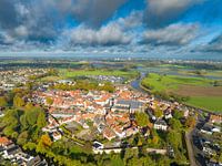 Luchtfoto van Hattem tijdens een mooie herfstdag. De stad Hattem grenst aan de ene kant aan de bossen van 'De Veluwe' en ligt aan de andere kant aan de rivier de IJssel, die te zien is op de achtergrond.
