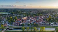 Luchtfoto van Hattem tijdens een warme zomeravond met wolken in de verte over de Veluwe van bovenaf gezien. De stad Hattem grenst aan de ene kant aan de bossen van 'De Veluwe' en ligt aan de andere kant aan de rivier de IJssel.
