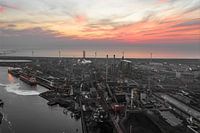 Deze panoramafoto legt de volledige uitgestrektheid van de Tata Steel-fabriek in IJmuiden vast, gelegen aan de Nederlandse Noordzeekust. De foto is gemaakt tijdens de late avond en combineert de warme gloed van de zonsondergang met de koele industriële verlichting van de staalfabriek eronder. De scène toont een ingewikkeld web van pijpleidingen, kranen en ovens die zich uitstrekken van het havengebied tot de kustlijn, waar windturbines en schepen de horizon markeren. Ik was gefascineerd door de dualiteit van deze omgeving - zware industrie tegenover de rust van de zee en de lucht. Het drone-perspectief laat zien hoe nauw de fabriek verweven is met het landschap, zowel geografisch als symbolisch, als een belangrijk onderdeel van de industriële identiteit van Nederland. De mix van kunstmatig en natuurlijk licht, rook en reflectie creëert een sfeer die zowel krachtig als contemplatief aanvoelt. Dit werk maakt deel uit van een breder onderzoek naar industriële architectuur en de transformatie van kustomgevingen onder moderne druk.