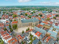 Luchtfoto van de stad Deventer met de Lebinius kerk in Nederland