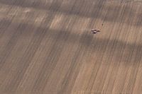 Luchtfoto van een tractor die een landbouwplantmachine trekt, rijdend in een veld met een lijnenpatroon.