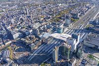 Omgeving van het vernieuwde Utrecht Centraal Station vanuit de lucht gefotografeerd. Zo zijn onder andere het vernieuwde Centraal Station, Hoog Catharijne, Muziekcentrum Vredenburg-Tivoli en het stadskantoor van de gemeente Utrecht te zien.