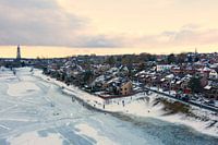 Luchtfoto van het besneeuwde stadje Rhenen aan de Nederrijn in Nederland bij zonsondergang in de winter