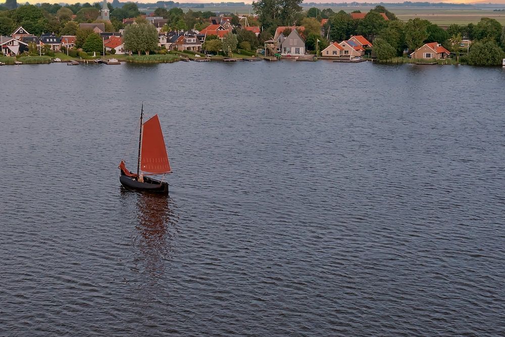 Luchtfoto van het dorpje Oudega in Friesland bij zonsondergang in Nederland