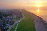 Luchtfoto van het plaatsje Wierum aan de Waddenzee in Friesland bij zonsondergang in Nederland