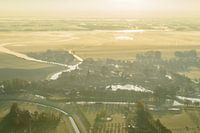 Luchtfoto van het stadje Blokzijl in Overijssel tijdens zonsopkomst tijdens een vroege ochtend in de lente. De haven ligt in het midden van het stadje en in de achtergrond is het natuurgebied Weerribben-Wieden te zien.
