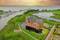 Luchtfoto van kasteel Muiderslot bij Muiden in Nederland bij zonsondergang
