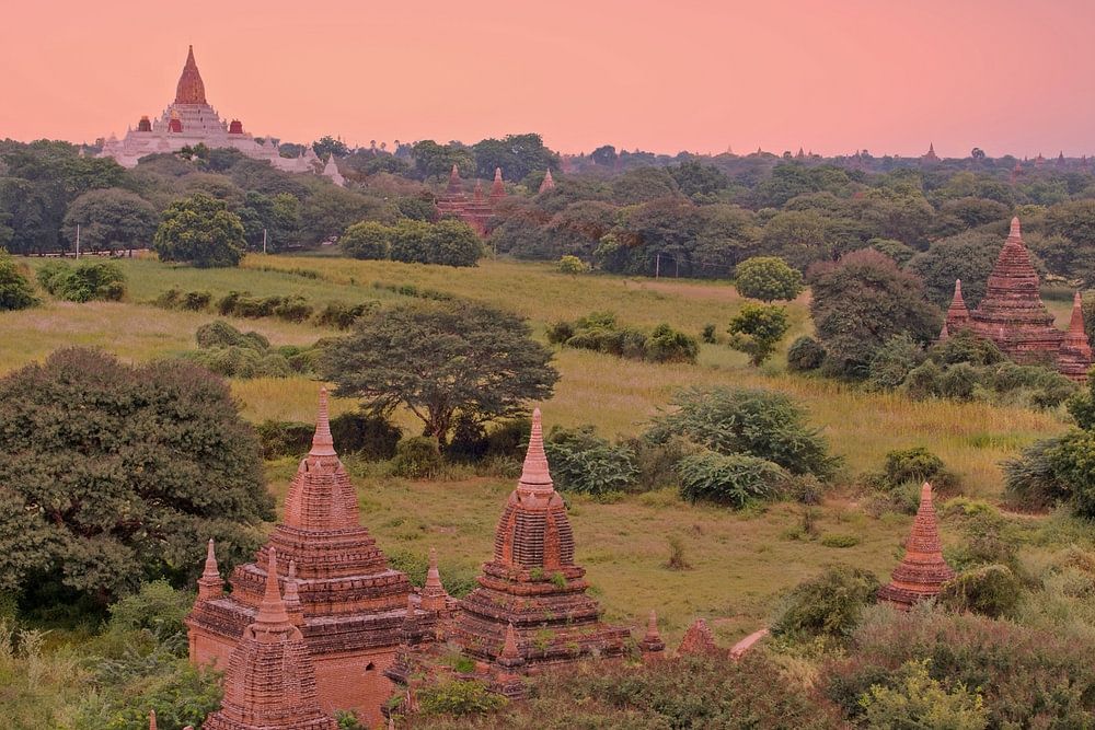 Luchtfoto van oude tempels in het landschap van Bagan in Myanmar Azie met zonsondergang