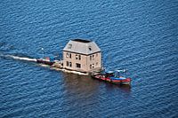 Luchtfoto van vervoer van een watervilla over het IJsselmeer, Nederland