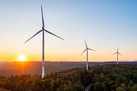 Windturbines in vogelvlucht in een windmolenpark bij Schorndorf in het Schurwald bij zonsopgang, Baden-Württemberg, Duitsland