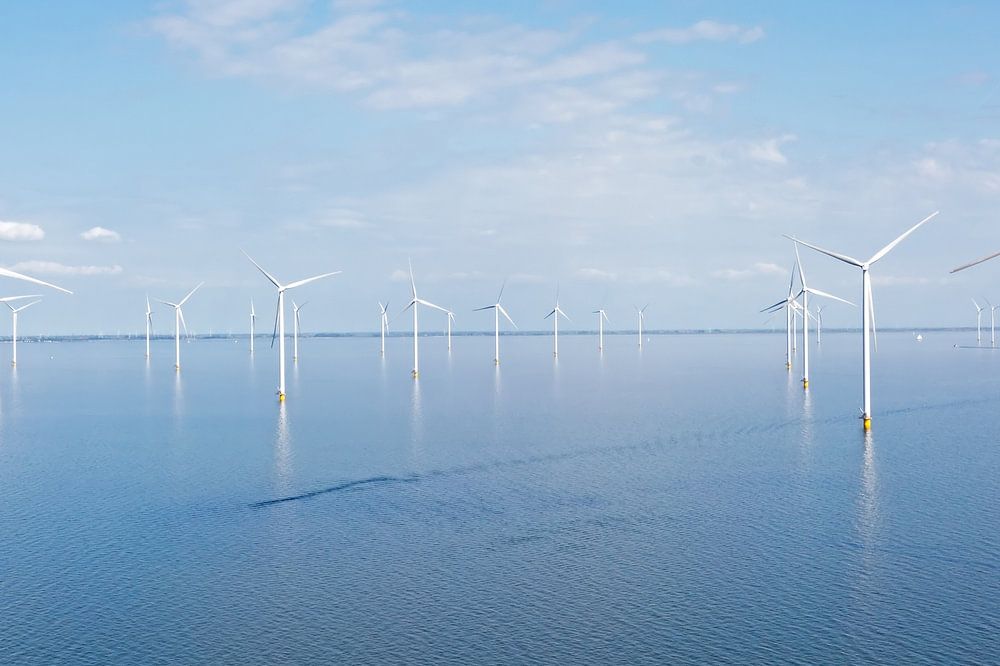 Luchtfoto van windturbines bij het IJsselmeer in Nederland
