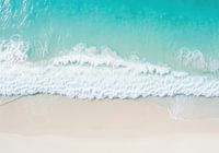 Luchtfoto van een strand: wit zand ontmoet turquoise water met witschuimende golven, opname van recht boven.