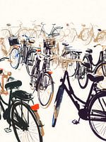 Dit werk toont een levendige verzameling fietsen die speels over het beeld verspreid staan. De zachte aquareltinten geven de scène een lichte en bijna zwevende uitstraling. De voorste fietsen zijn duidelijker uitgewerkt terwijl de achtergrond vervaagt in losse lijnen en zachte contouren. Dit zorgt voor een gevoel van diepte zonder druk…