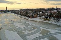 Luchtopname van de besneeuwde stad Rhenen in Nederland bij zonsondergang