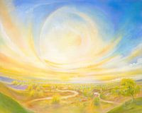 Dit indrukwekkende olieverfschilderij betovert de kijker met zijn sublieme helderheid en het stralende licht dat het hele tafereel overspoelt. Het lijkt alsof de duisternis volledig is verbannen, omdat het licht in zijn intense helderheid de wereld verlicht en overheerst.