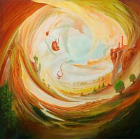 Het schilderij presenteert een wereld van puur surrealisme die de kijker betovert. Het is een scène vol bizarre en tegenstrijdige elementen die zowel fascinerend als verwarrend is. Het schilderij vormt een enorme draaikolk, een energetische voorstelling die doet denken aan een overblijfsel van DNA en daarmee een symbool is van leven en beweging. Het is een wereld die constant in beweging is en zichzelf onophoudelijk herschept.
