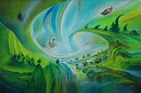 Samengevat is dit surrealistische olieverfschilderij een virtuoze weergave van een wereld waarin de wetten van de werkelijkheid zijn opgeschort. Het prikkelt de verbeelding, nodigt uit tot nadenken en daagt conventies uit. Het daagt de kijker uit om de grenzen van waarneming en begrip te verleggen en zich onder te dompelen in een fascinerende wereld waarin alles mogelijk lijkt.