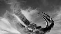 Over ‘Luchtshow met vliegend eskader en rook in bewolkte hemel in zwart-wit’ van Dieter Walther