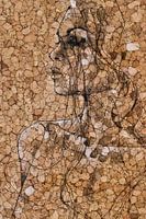 Een figuratief abstract werk van zwart draad, houtskool & krijt op kurk.