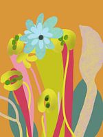 Dit digitale kunstwerk straalt een speelse en eigentijdse elegantie uit, waarin organische vormen en levendige kleuren harmonieus samenkomen. De compositie doet denken aan een abstract bloemenveld, waarin zachte, afgeronde lijnen en transparante lagen elkaar overlappen en een gevoel van diepte creëren.