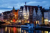 Prachtige historische huizen van de oude stad Lübeck op het blauwe uur.