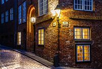 Poppentheater, historisch huis in de oude stadskern van Lübeck in de late avond.