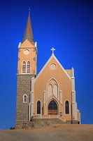 In Lüderitz staat op een heuvel deze kerk welke prachtig afsteekt tegen het volle blauw van de lucht.