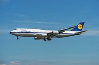 Deze "Queen of the skies" van Lufthansa in retro livery (registratie vliegtuig D-ABYT) vlak voor de landing gefotografeerd bij de luchthaven van Frankfurt am Main.