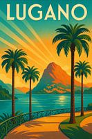 Deze reisposter in art-decostijl viert de mediterrane charme van Lugano, het Zwitserse juweeltje aan het meer. De illustratie toont palmbomen langs een promenade aan het water, met de iconische Monte Brè op de achtergrond, badend in warme zonsondergangstinten. Het levendige oranje, groenblauwe en turquoise palet creëert een opvallende retrolook die de sfeer van Zuid-Zwitserland direct in je interieur brengt. Lugano's unieke mix van Italiaanse flair en Zwitserse elegantie is perfect vastgelegd in dit ontwerp, waardoor het een must-have is voor liefhebbers van reisposters. Deze print is ideaal als muurkunst voor thuis, in cafés of op kantoor en voegt een zonnige en stijlvolle sfeer toe aan elk interieur. Het is ook een prachtig cadeau voor liefhebbers van de Italiaans-Zwitserse cultuur, retroposters of schilderachtige merenlandschappen. Met zijn nostalgische en tijdloze uitstraling combineert dit Lugano-kunstwerk vintage reisromantiek met de charme van de mediterraan geïnspireerde Zwitserse schoonheid.